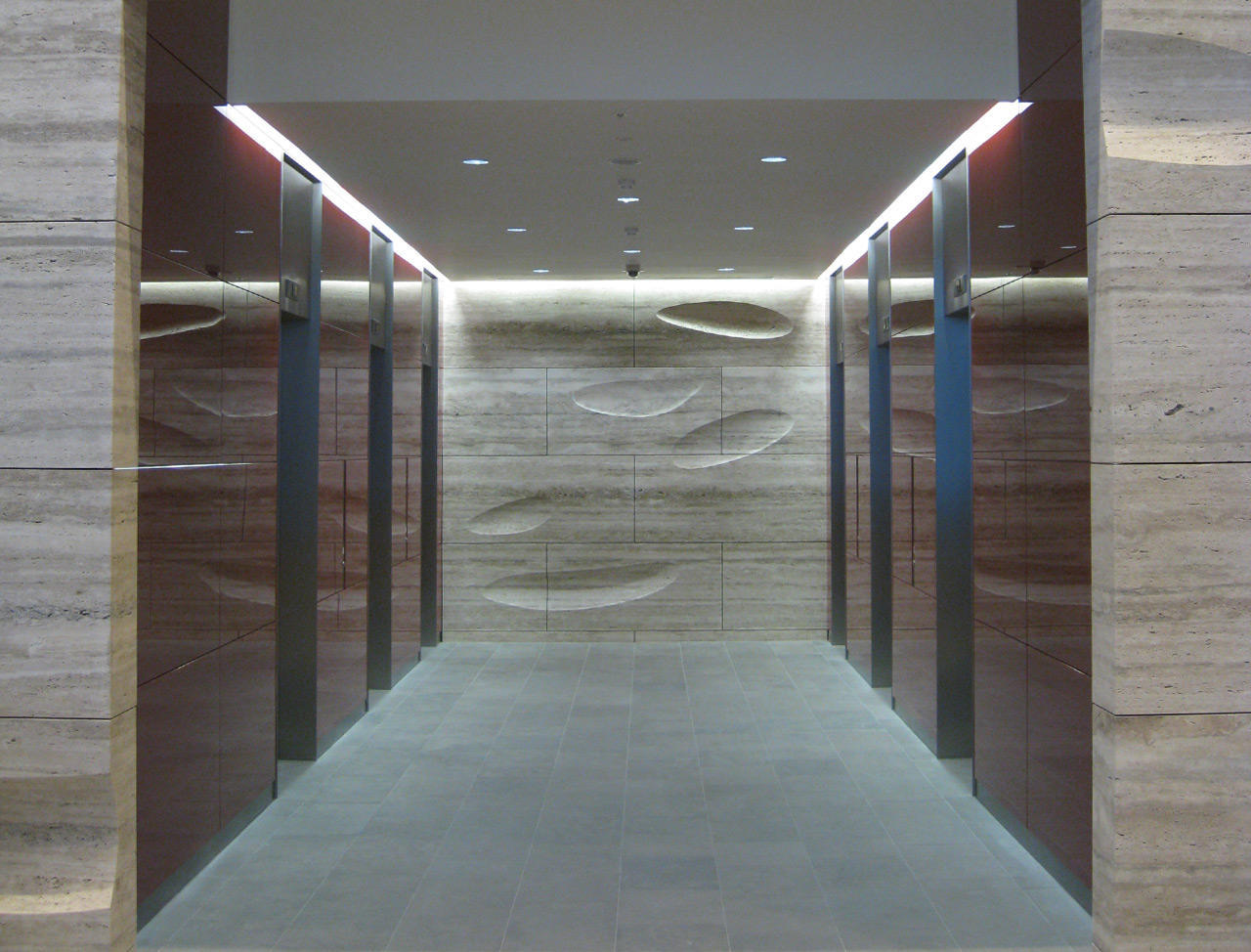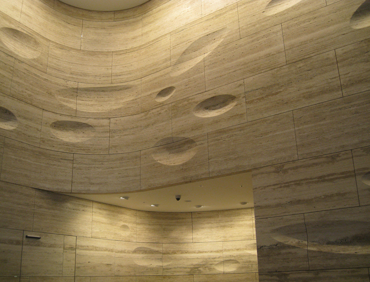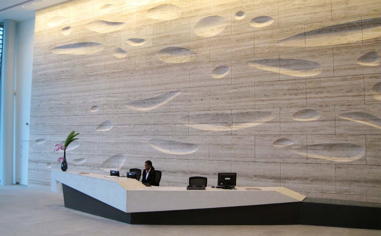 Early in 2008 the teams of Andre Schuberth and stonemason Laurent Chauvaux joined forces to carry out the stone work for a large interior wall structure. It was to become the most striking visual feature of the atrium at 20 Gresham Street in the City of London, and an award-winning piece of architecture. The wall in question was 8 metres high and 60 metres long, comprised entirely of Travertine blocks from Italy.