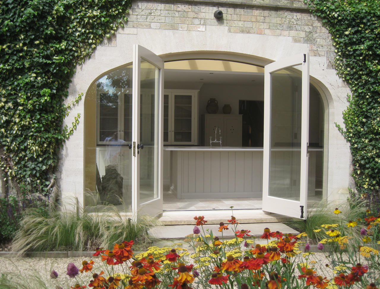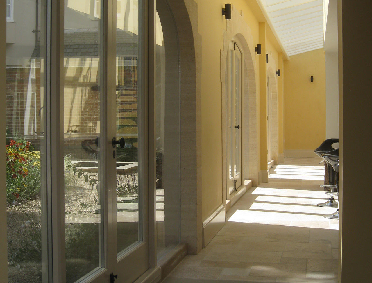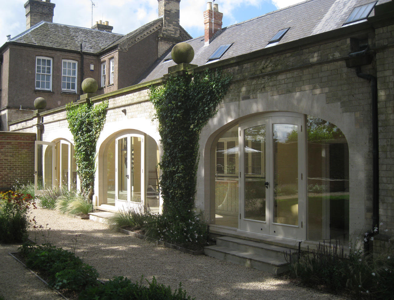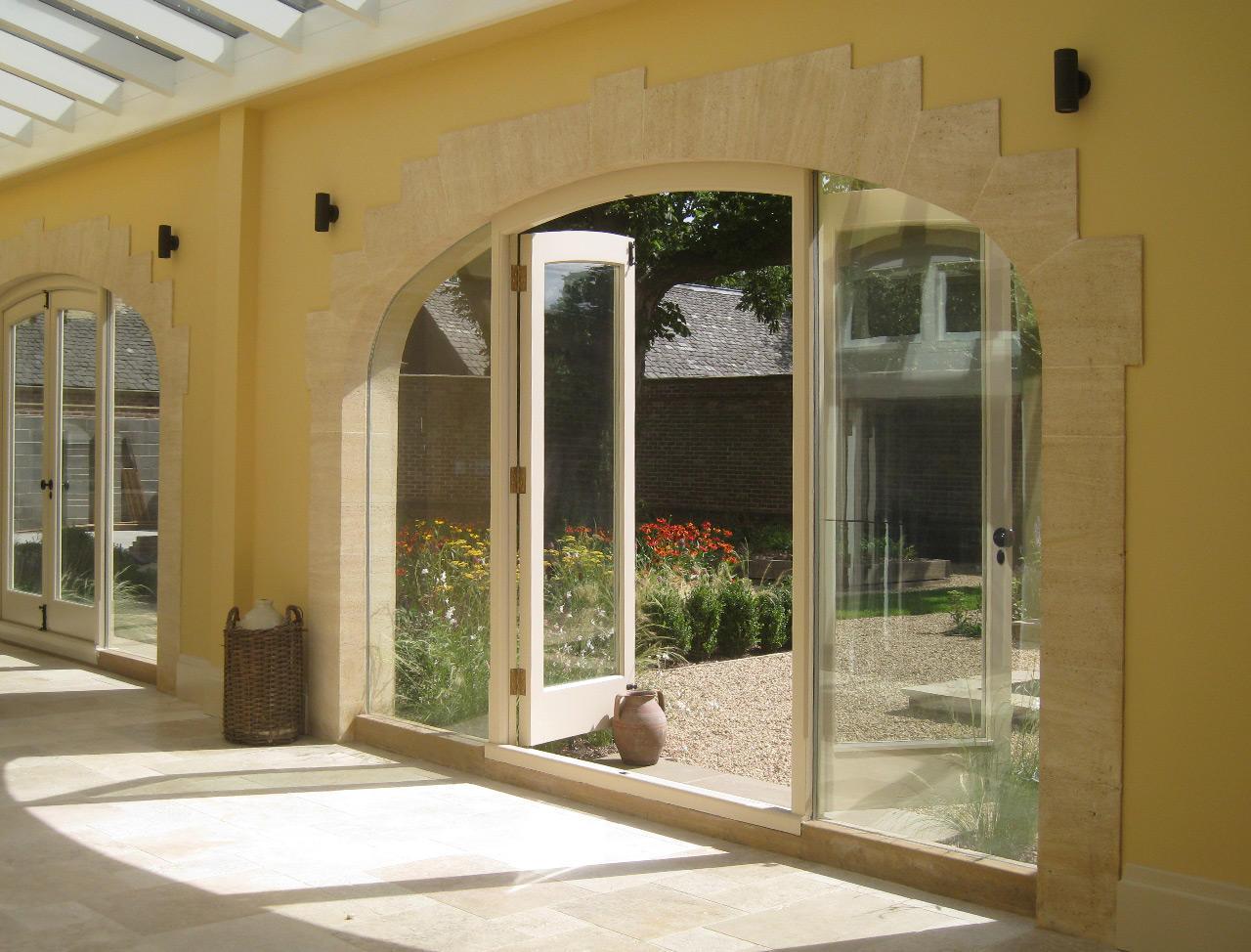 During the project it was proposed to the client that frameless glass should be inserted directly into the stone arches running the length of the kitchen wall. This allowed even freer flow of light from the garden into the open plan kitchen space. The house was put on the market and sold within a week; these windows were among its most attractive selling points, they are clean cut while preserving the pleasant ancient feel of bare stone.