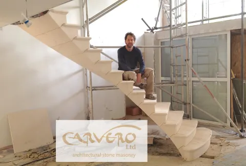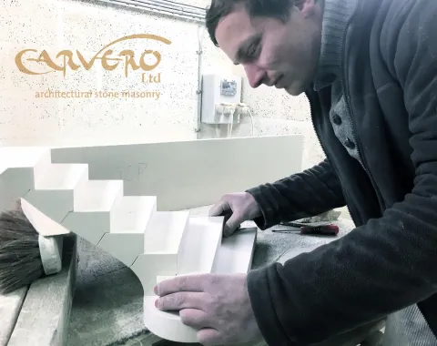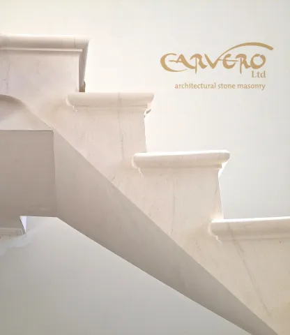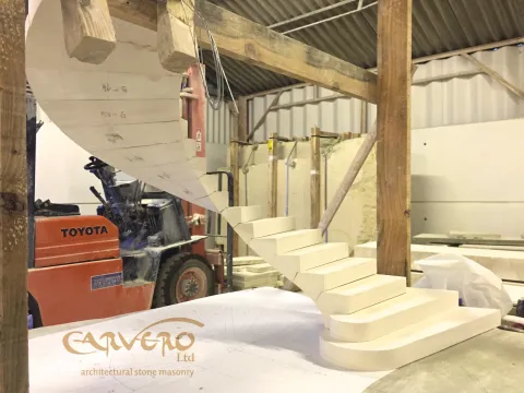 For some time now, we have been working on the design and the technology to make floating staircases out of solid stone a reality. Inspired by staircases like the staircase of the Loretto Chapel we build models in different sizes and worked hand in hand with our engineers. Tested our models until they break and pushed for slimmer and more elegant solutions. One of the results is this floating limestone staircase we instaled in Surrey in 2014. Carvero designed every detail, along with the templates for the glass balustrade. As every piece of stone is hand carved in our workshop, we are able to react and adjust very quickly when changes are made in floor heights etc.