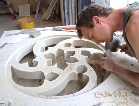 We chose an Italian limestone which we normally use for our stone fireplaces, door surrounds or stone mullion windows. It is a limestone very fine in grain and allows for very sharp edges. Also over time, it creates its own patina and turns into a beautiful light blue grey colour. As you can see in the pictures, it is truly hand carved and by doing so Gregory learnt some useful new techniques. He has definitely done a great job. Thanks Gregory!!!