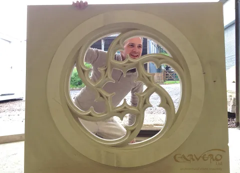 So I decided we are going to make one for ourself. Tracery windows are of the most extensive variety, both in design and form. Often they are bigger than our chosen design and made of several pieces. We started making it some weeks ago and every time we had a bit of time we worked on it. Gregory a French stonemasons from Strasbourg working here in our workshop near Loughborough in Leicestershire, had the honour of carving this delicate piece of Gothic architecture and I have to say I am a bit jealous.