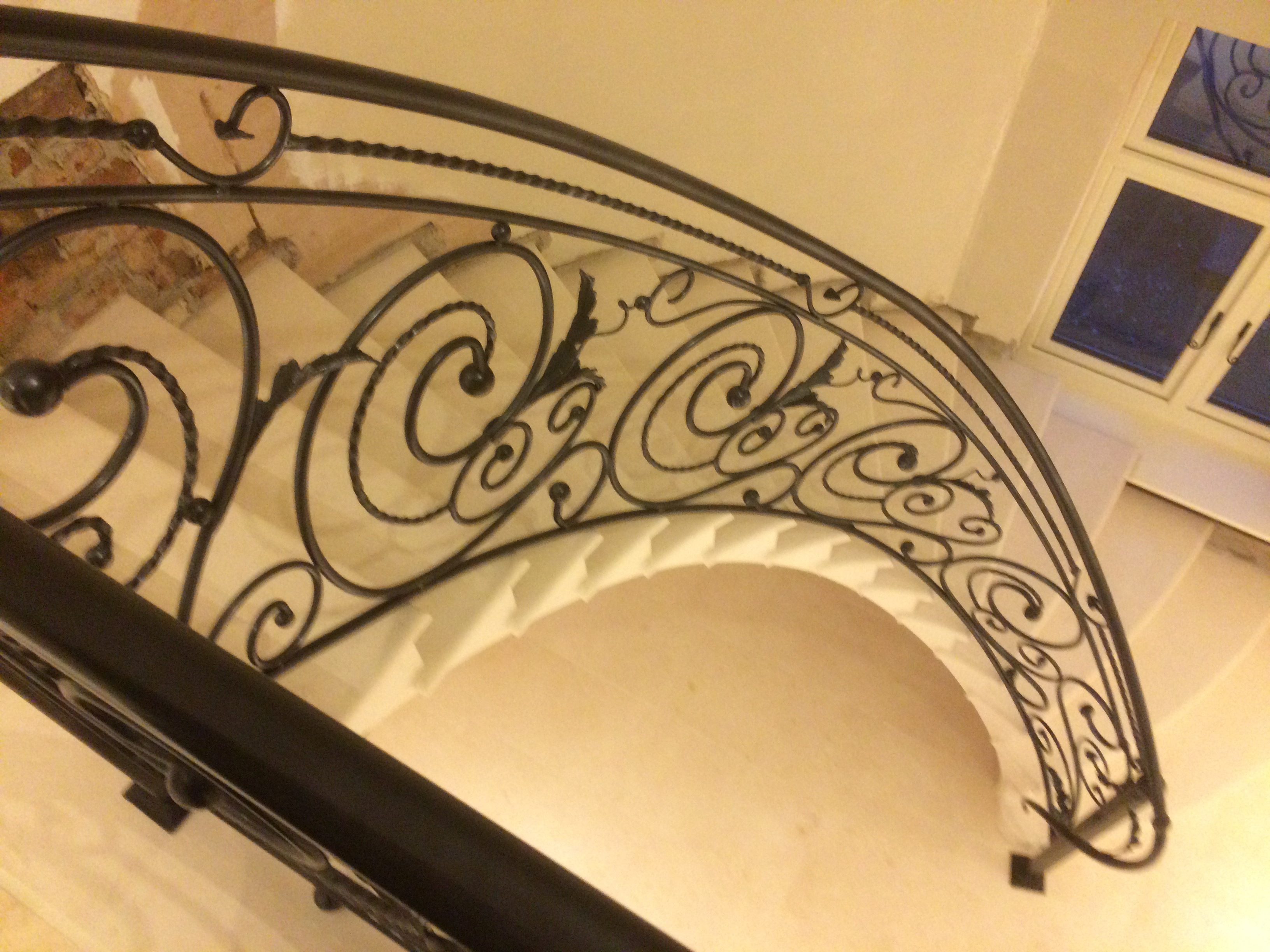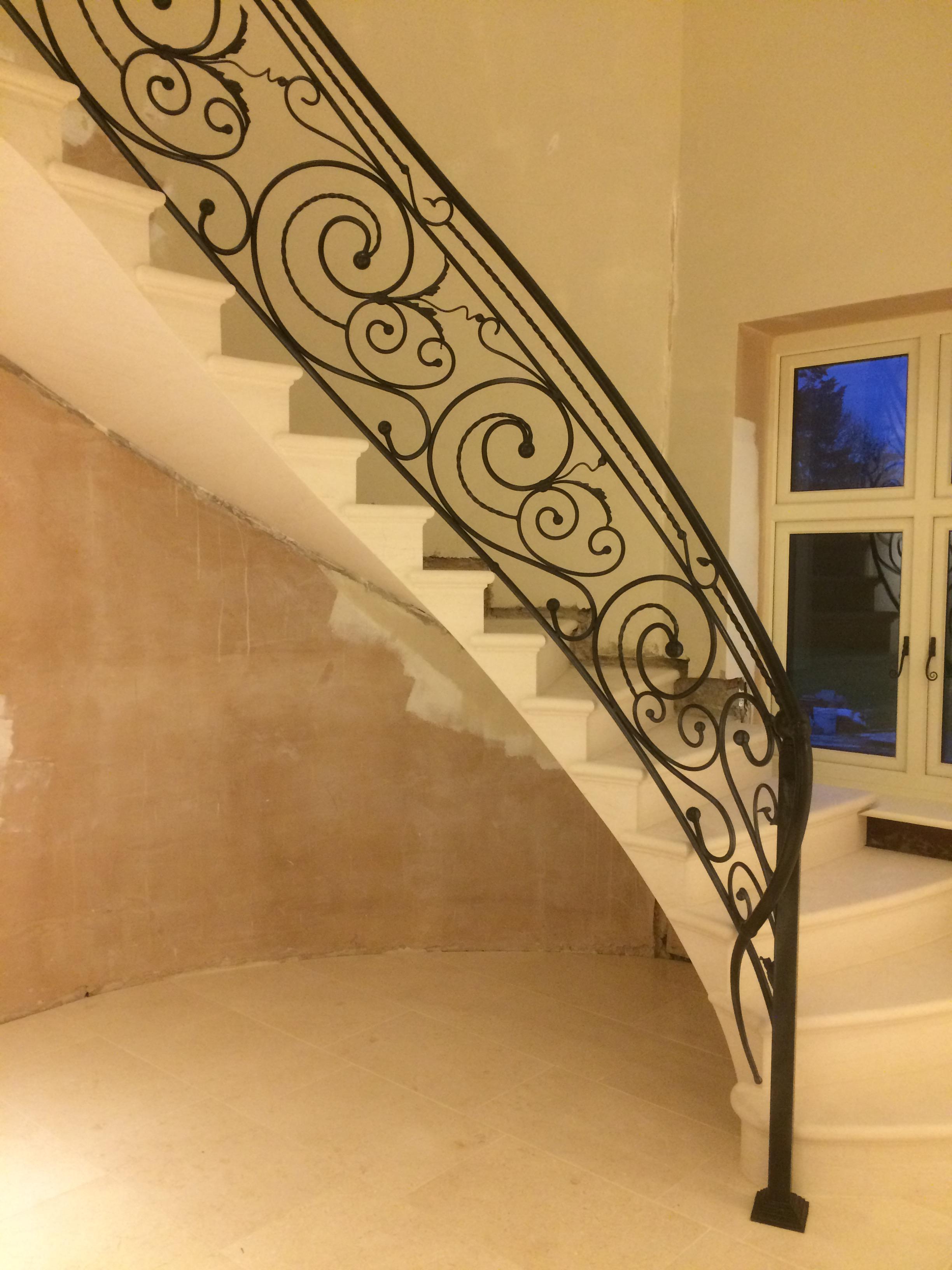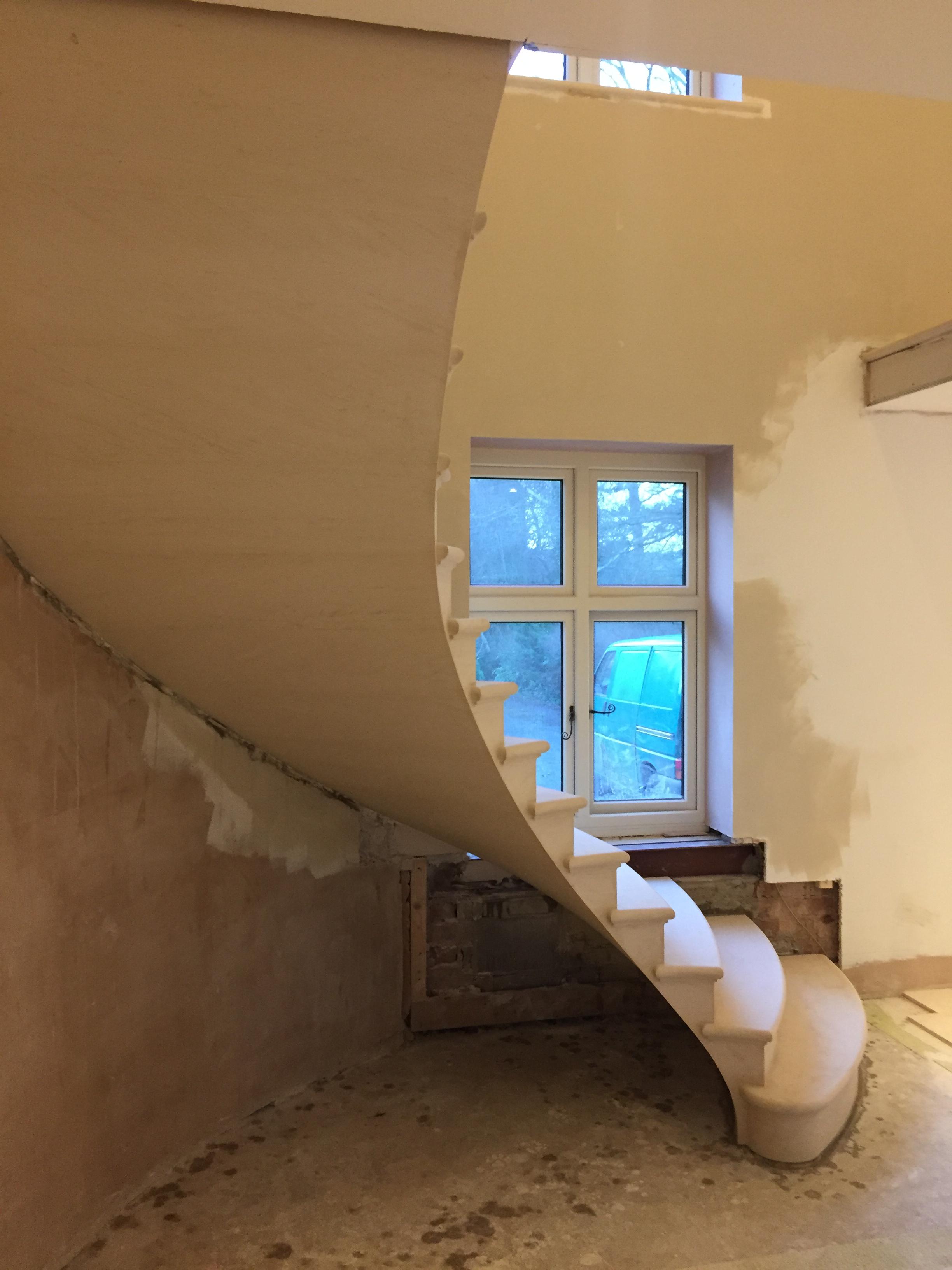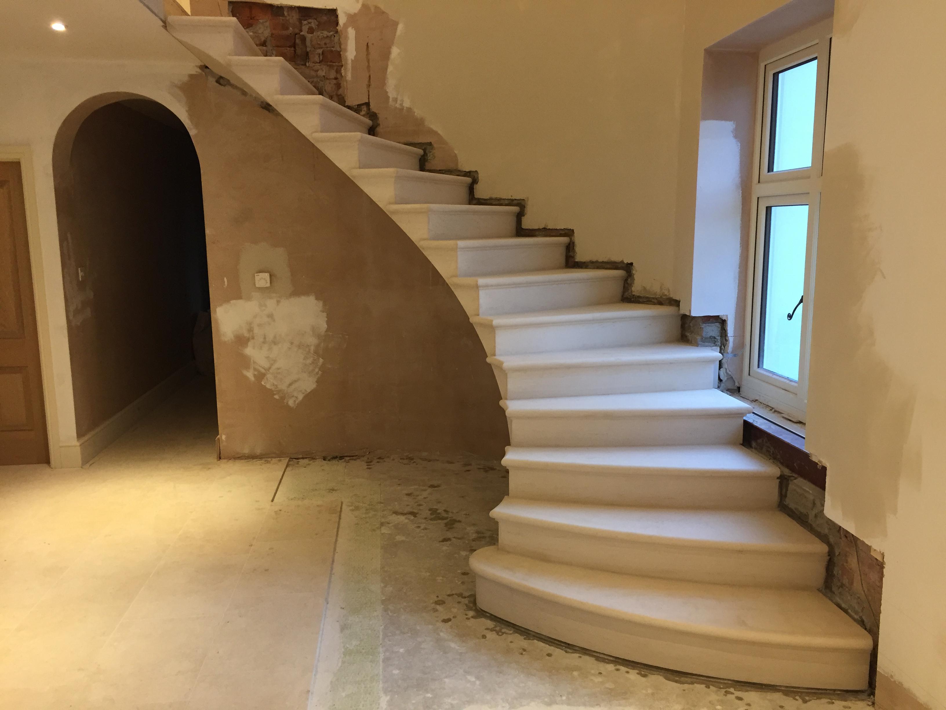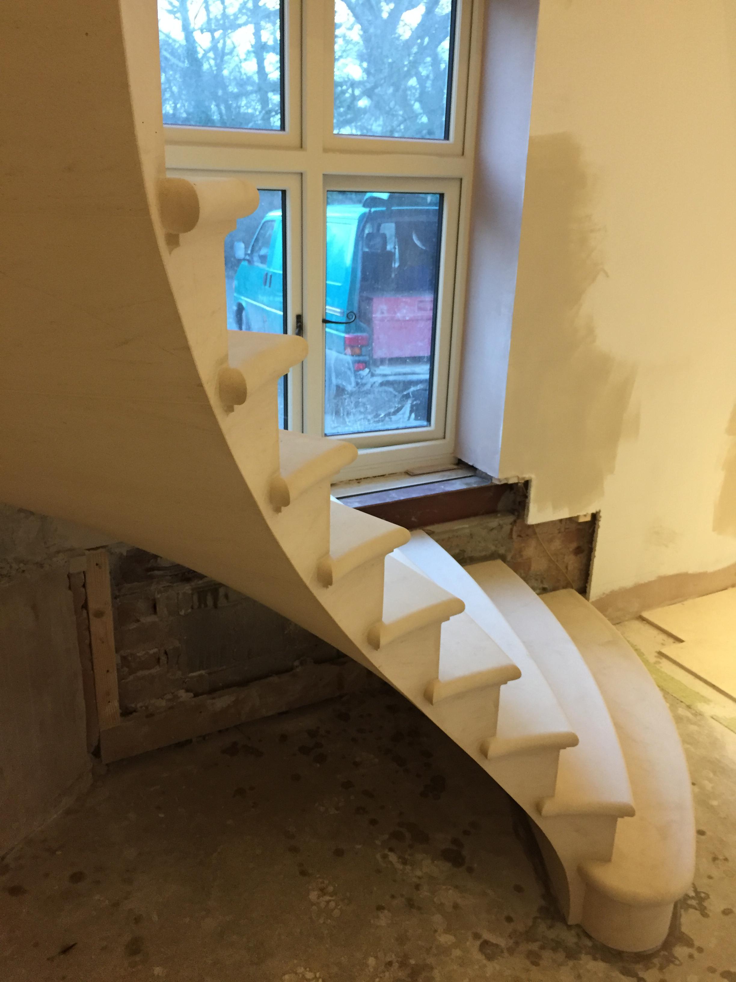 This elegant limestone staircase installed near Shrewsbury, features an smooth curving soffit, elegantly sweeping upward to a matching limestone apron all expertly carved to millimetre precision. An interesting detail is the free-floating stone step crossing over in the window.