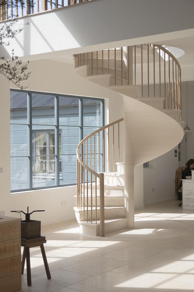 We were honoured and delighted that such a high end furniture maker as the deVOL kitchens company has chosen us to design and manufacture this extraordinary spiral stone staircase for their new showroom at Cotes Mill in Loughborough. Being able to showcase our high end products and leaving a trace of our knowledge and skills at such a historic place as the Mill makes us very proud.